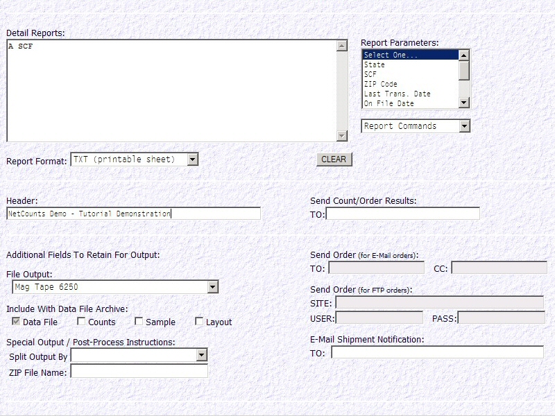 A basic request usually includes a selection parameter (such as a search by states or demographics), and a Detail Report (to break