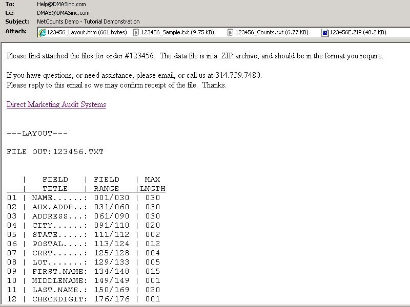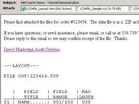 The order body contains the order number, the file layout and quantity, and instructions for opening the attached file.